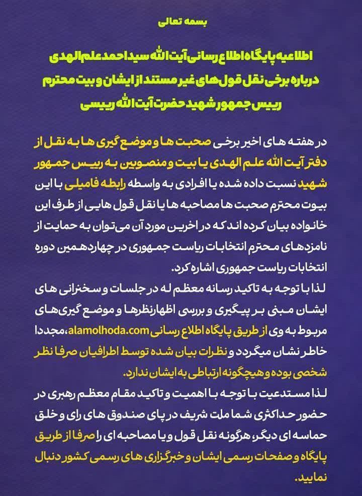 به گزارش تابناک رضوی، در هفته های اخیر برخی صحبت ها و موضع گیری ها به نقل از دفتر آیت الله علم الهدی یا بیت و منصوبین به رییس جمهور شهید نسبت داده شده یا افرادی به واسطه رابطه فامیلی با این بیوت محترم صحبت ها مصاحبه ها یا نقل قول هایی از طرف این خانواده بیان کرده اند که در اخرین مورد آن میتوان به حمایت از نامزدهای محترم انتخابات ریاست جمهوری در چهاردهمین دوره انتخابات ریاست جمهوری اشاره کرد.